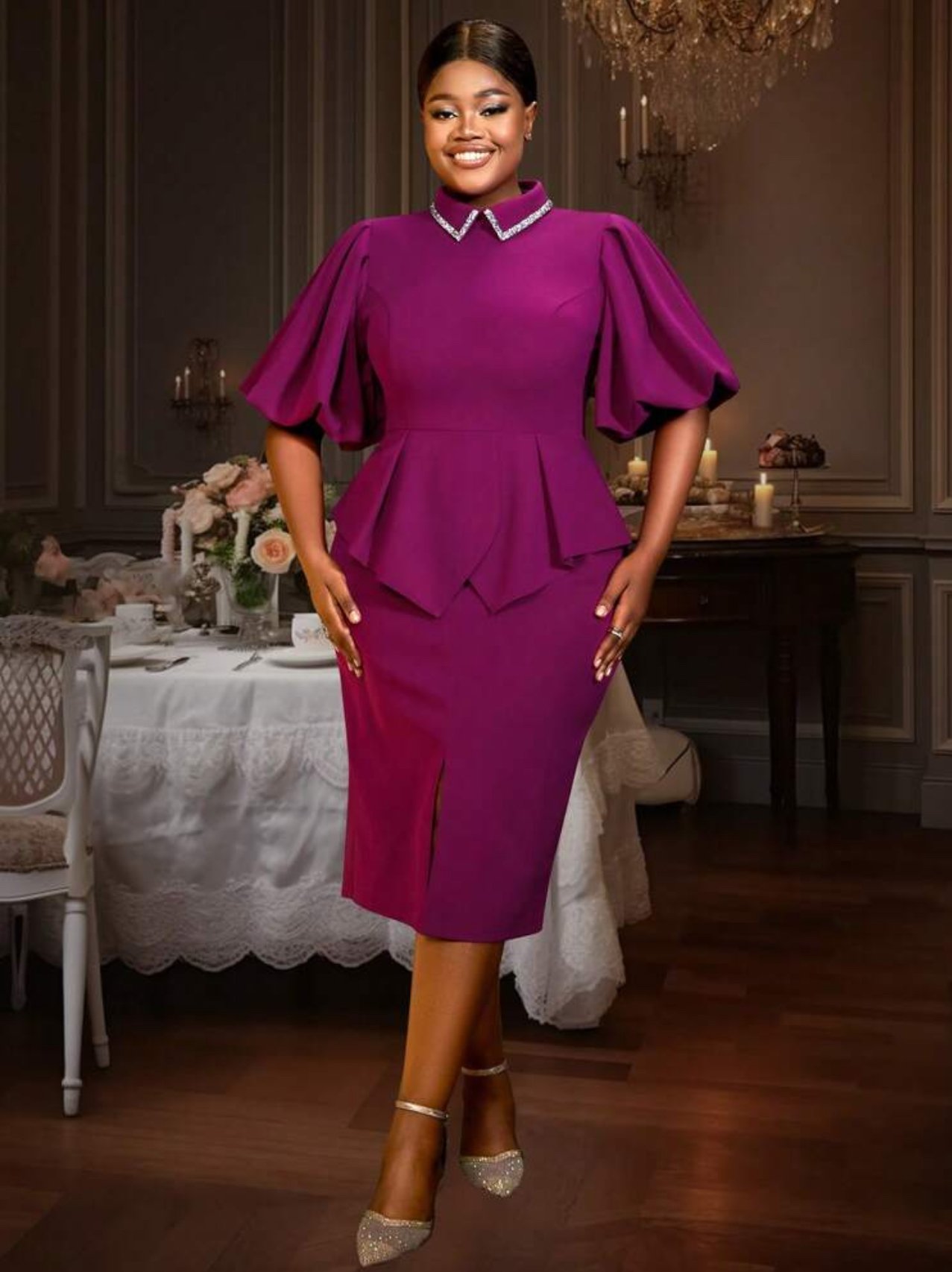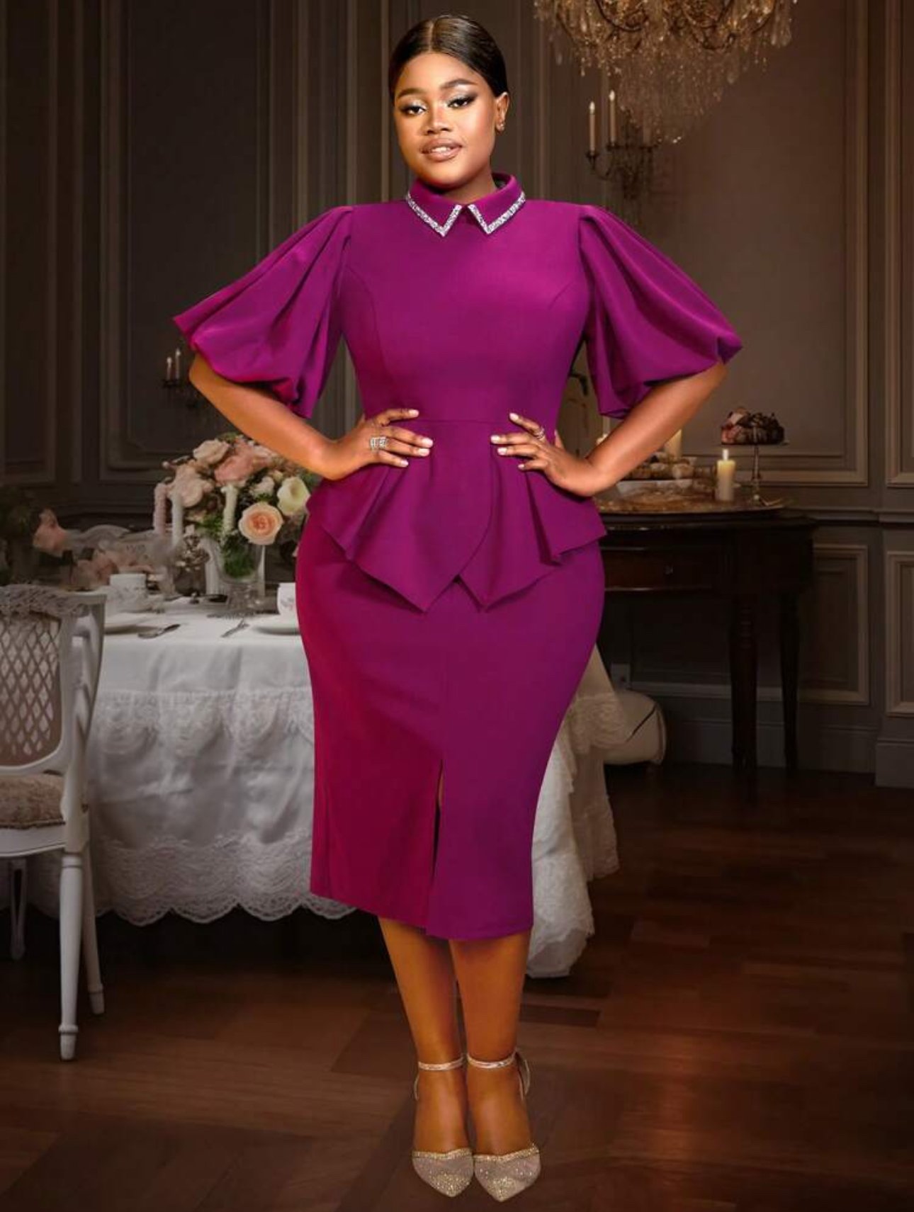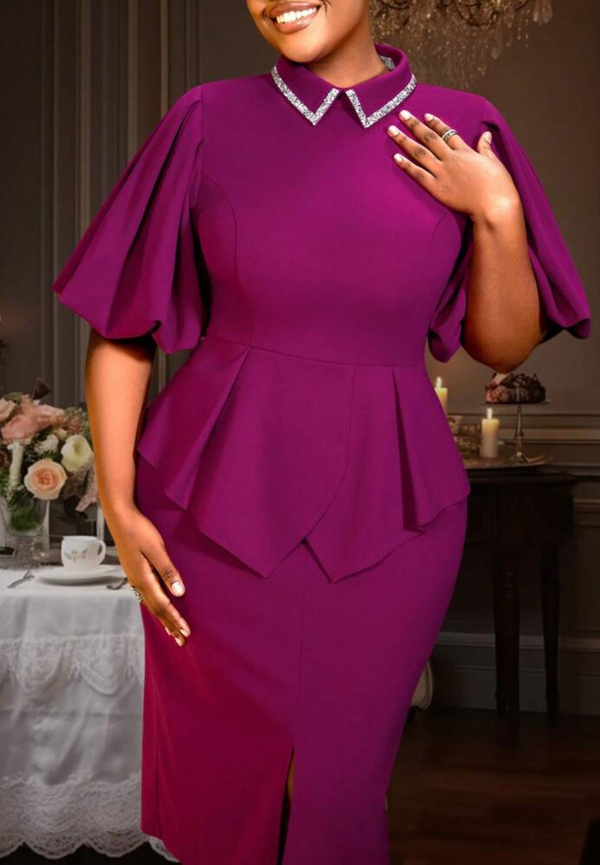 Beaded shirt collar peplum midi dress – Purple/pink